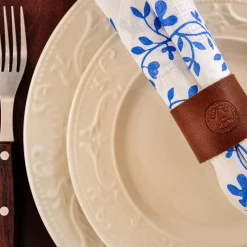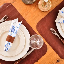 Varje tablett och servettring har vår logga stilrent ingraverad (nere i högra hörnet på tabletten). Utöver det är det den naturliga strukturen i skinnet som är huvudpersonen. De går precis lika bra att använda utomhus som inomhus och passar bra till såväl söndagsfrukosten som middagsbjudningen.